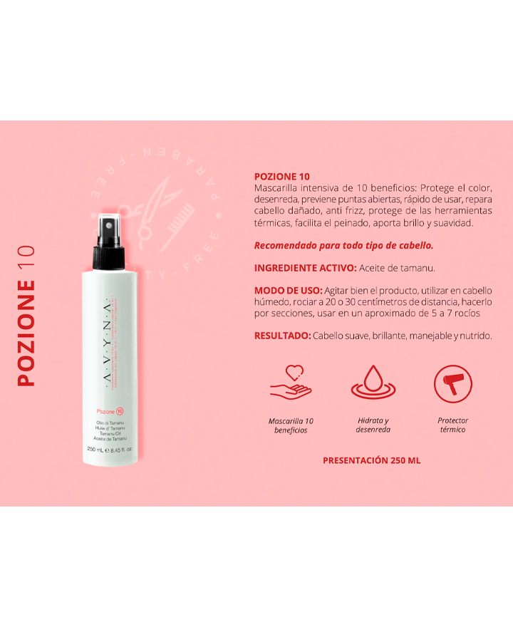 Mascarilla intensiva de 10 beneficios: Protege el color, desenreda, previene puntas abiertas, rápido de usar, repara cabello dañado, anti frizz, protege de las herramientas térmicas, facilita el peinado, aporta brillo y suavidad.