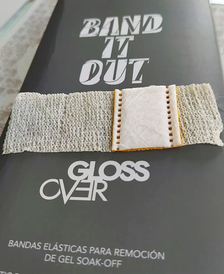 Bandas elásticas de neopreno con cojinete de algodón comprimido, con perfecta fijación al dedo. Son auxiliares para retirar geles soak-off y acrílico. Al envolver las uñas con Bandit-Out humedecido con Geloff, remover o acetona pura, se acelera la acción de ablandamiento del gel y acrílico, para su fácil remoción.
