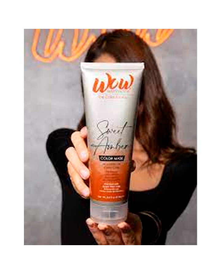 WOW SWEET AMBER COLOR MASK matiza y aporta efectos de color caramelo y chocolate claro en el cabello previamente decolorado. Ayuda a mantener el tono castaño claro en el color cosmético, además de generar un excelente acondicionamiento y desenredo.