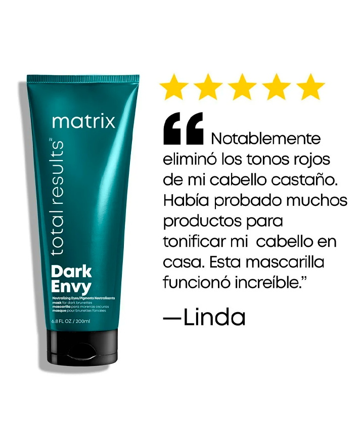 Dark Envy Red Neutralization Hair Mask tiene una concentración compleja de tintes para neutralizar los matices rojos en las bases oscuras, mientras nutre profundamente la fibra capilar y deja un brillo radiante.