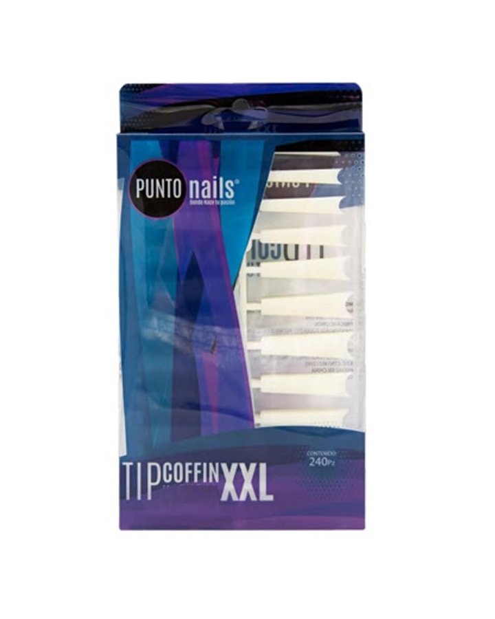 Tips Coffin XXL 240pzas Punto Nails. Este tipo de tips tienen forma de zapatilla de bailarina de ballet pero con un tamaño XXL. Los tips sirven para la aplicación de uñas de gel o de acrílico. El largo ideal para lucir uñas femeninas es muy variado y depende de los gustos de cada persona. Gracias a los tips conseguimos darle el largo ideal para la uña de la clienta, haciéndolas ver mucho más largas o estilizadas que las uñas naturales además de tener una duración mas prolongada. También puedes probar la variedad en tonos de tip, siendo los mas solicitados los tonos naturales, french o francés y el cristal o transparente.