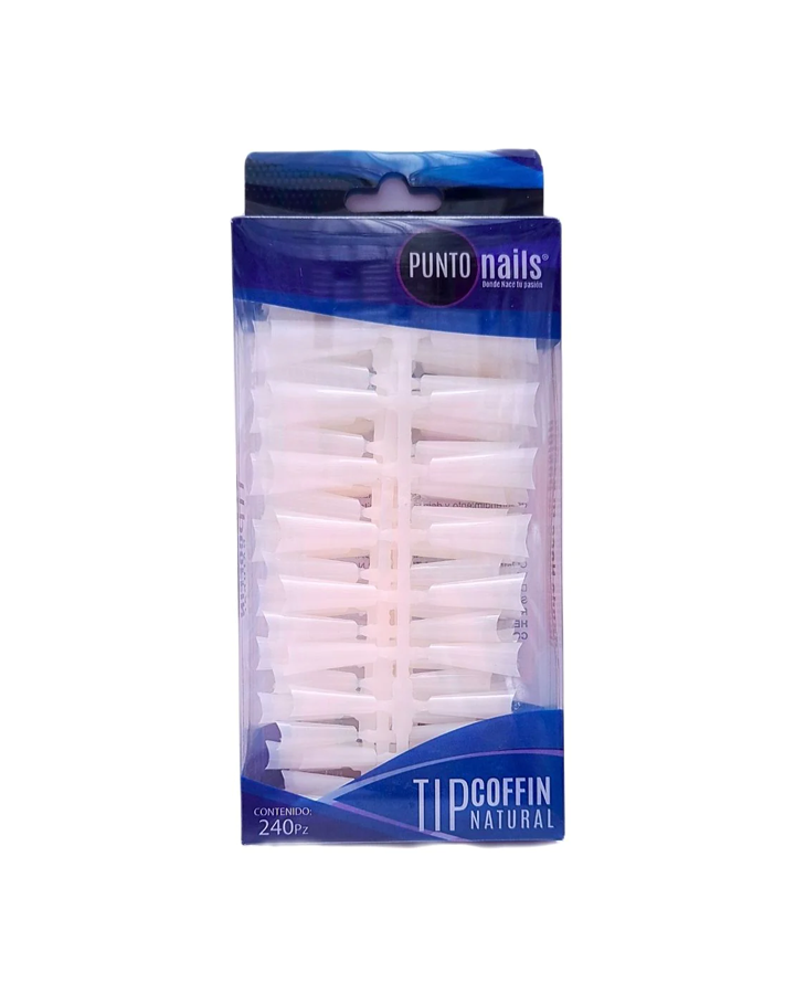 Tips Coffin 240pzas Punto Nails. Este tipo de tips tienen forma de zapatilla de bailarina de ballet. Los tips sirven para la aplicación de uñas de gel o de acrílico. El largo ideal para lucir uñas femeninas es muy variado y depende de los gustos de cada persona. Gracias a los tips conseguimos darle el largo ideal para la uña de la clienta, haciéndolas ver mucho más largas o estilizadas que las uñas naturales además de tener una duración mas prolongada. También puedes probar la variedad en tonos de tip, siendo los mas solicitados los tonos naturales, french o francés y el cristal o transparente.