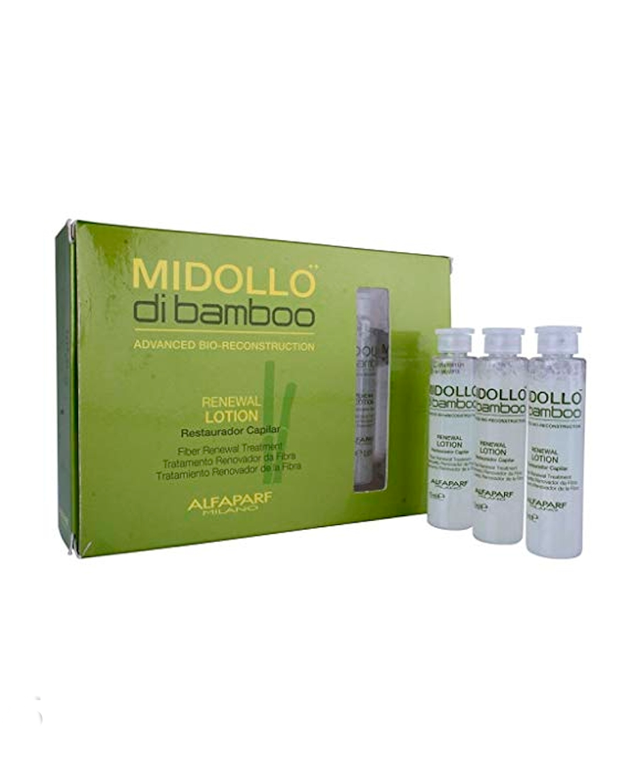 Caja de Ampolletas de Tratamiento sin Enjuague para Cabello Midollo Di Bamboo es un tratamiento en mono-dosis y sin enjuague para reparar y fortalecer el cabello desfibrado, extremadamente dañado y debilitado.