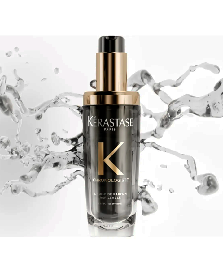 Kérastase Chronologiste L'Huile de Parfum es un aceite capilar perfumado que combina la sofisticación de la alta perfumería con el cuidado avanzado del cabello. Su fórmula está enriquecida con extracto de mirra, un ingrediente conocido por sus propiedades regenerativas, que revitaliza, hidrata y engrosa la fibra capilar sin apelmazar. Su exquisita fragancia está compuesta por una armoniosa mezcla de rosa de té, maderas ligeras y almizcle, dejando una estela elegante y duradera.