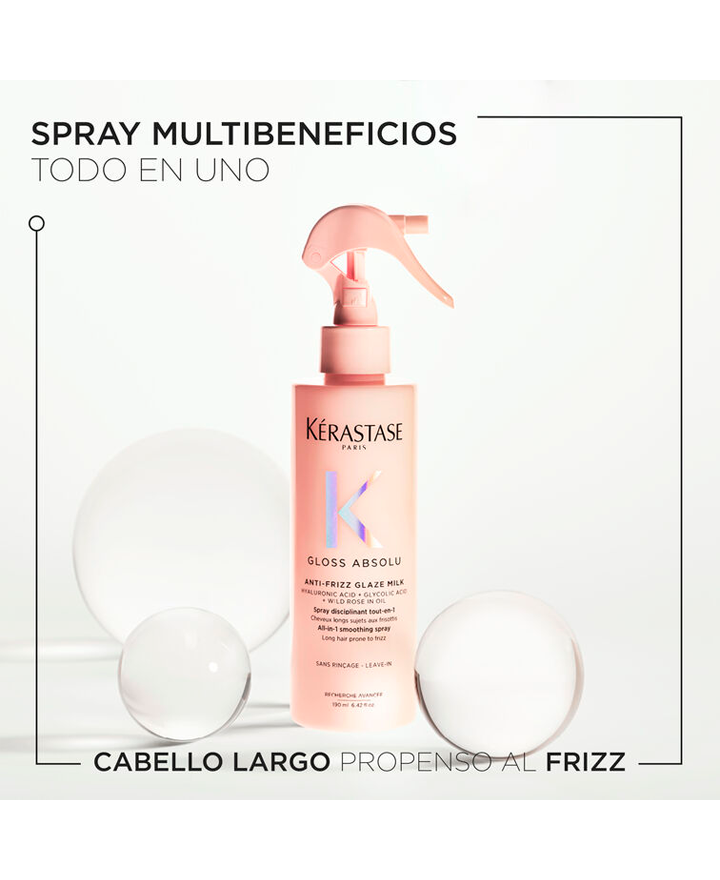 Anti-Frizz Glaze Milk de Kérastase es un spray suavizante todo en uno para cabello largo con tendencia al encrespamiento. Su fórmula, a base de ácido hialurónico, ácido glicólico y extracto de rosa silvestre, te proporciona un cabello glossy: suave, con brillo y ligero