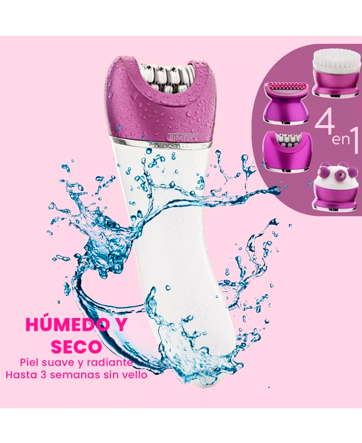 Incluye 4 cabezales intercambiables: para rasurado, depilación, limpieza facial y masaje corporal.